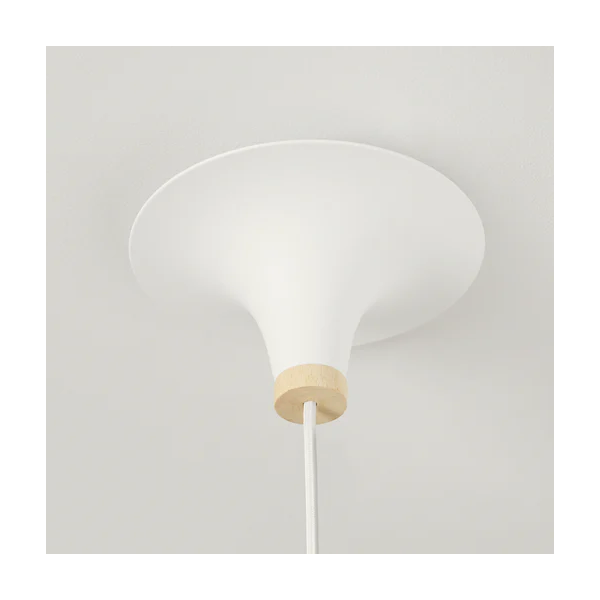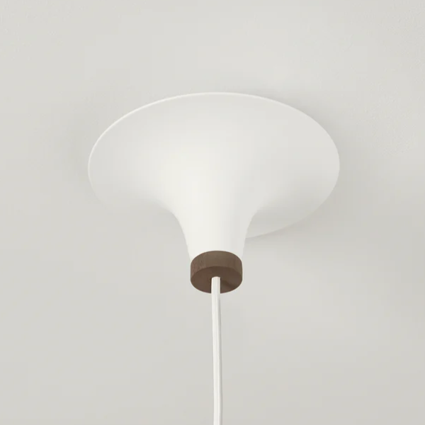 Virtaviivainen ja hienostunut valaisin on ripustettu katosta silkkinauhalla, joka peittää virtajohdon sen sisällä. Valaisin kiinnitetään kattoon varjostimen tyyliin muotoillulla kattokuvulla. Pakkauksessa tulee aina sekä tumman pähkinäinen sekä vaalea saarninen puuosa joka mahdollistaa valaisimen sopimisen monenlaiseen ympäristöön.