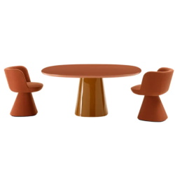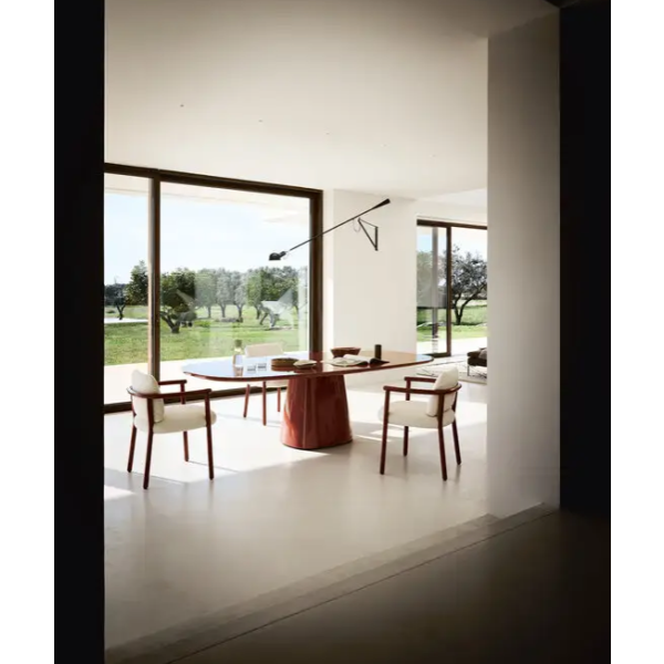 Pyramidimainen jalusta yhdistyy pöytälevyyn harmonisesti, herkillä mittasuhteilla ja kuitenkin pöydän kokonaisuus on visuaalisesti elegantti ja rakenteellisesti vakaa.