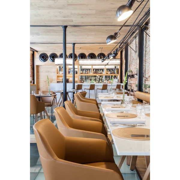 Materiaali: teräs, massiivipyökki, pyökkivaneri, joustava polypropyleenivyö, paloturvallinen polyuretaanivaahto vaihtelevilla tiheyksillä, aniliininahkaverhoilu, polypropyleenitassut