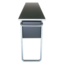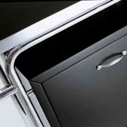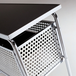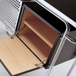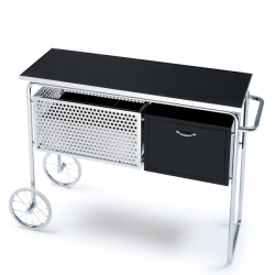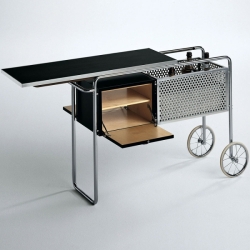 Materiaalit: Runko on valmistettu kromatusta ja kiillotetusta putkiteräksestä, halkaisijaltaan 20 mm. Säilytyslaatikossa on kaksi pientä vaahterapuista kääntöovea, jotka on lakattu mustaksi. Jääastia on kevyttä metallilevyä ja pulloastia on rei'itettyä alumiinia. Pyörät ovat kromattua terästä ja niissä on valkoiset renkaat. Vedettävä yläosa on monikerrospaneelia, jossa on teräsvahvisteiset reunat ja se on päällystetty mustalla melamiinilla.