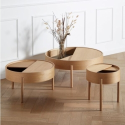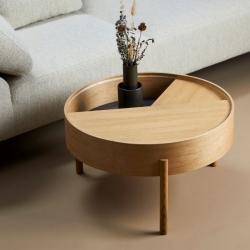 ARC -sohvapöytä leikittelee geometrisilla muodoilla: ympyrällä ja sen sektoreilla. Kääntyvä pöydän kansi kätkee sisäänsä kätevää säilytystilaa, joka joko piilottaa ei-toivotun tavaran, tai antaa mahdollisuuden sommitella esineitä kiinnostavasti kahteen tasoon.