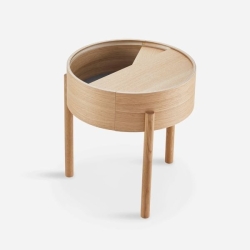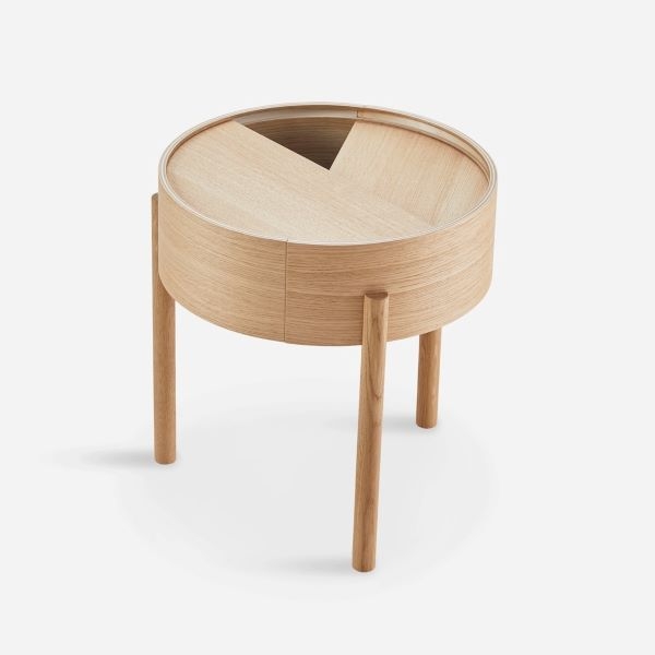 ARC -sohvapöytä leikittelee geometrisilla muodoilla: ympyrällä ja sen sektoreilla. Kääntyvä pöydän kansi kätkee sisäänsä kätevää säilytystilaa, joka joko piilottaa ei-toivotun tavaran, tai antaa mahdollisuuden sommitella esineitä kiinnostavasti kahteen tasoon.