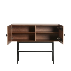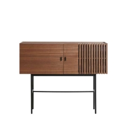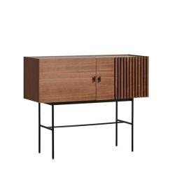 Array kaapistot ja senkit ovat saaneet innoitusta visuaaliseen kieleensä modernin arkkitehtuurin käyttämästä puurimoituksesta. Ne tuovatkin tähän tyylikkääseen ja geometrisen skarppiin senkkiin oman olemuksensa jossa myös valo ja varjo vaihtelevat mielenkiintoisella tavalla. Läpinäkyvyys luo myös kiinnostavan kontrastin muuten ovilla suljettavaan, umpinaiseen senkkiin. Kapeat ja korkeat jalat viimeistelevät kokonaisuuden.