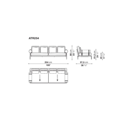 MItat: pituus 254 cm, syvyys 97,5 cm, korkeus 86 cm, Jalkojen korkeus 20,5 cm, istuinkorkeus 45 cm, käsinojien korkeus 61,5 cm