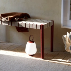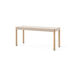 Betty-penkin funktionaalisen simppeliin ilmeeseen tuo lämpöä pellavainen satulavyöpunos, jolle penkin harkittu sävymaailma tuo oikeutta.