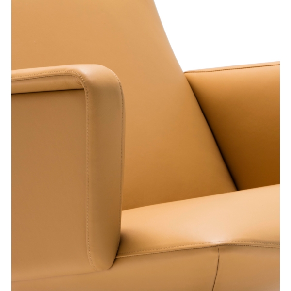 Tämä verkkokauppamme versio on nahkaverhoiltu malli BU1963, jossa on pyörivä mustaksi maalattu metallijalusta self return-mekanismilla. Nojatuolin saa lisämaksusta myös kallistusmekanismilla. Tuolin kaveriksi on saatavilla yhteensopiva rahi. Verhoiluvaihtoehtoja on tarjolla lukuisia erilaisia, ja myös jalkaa saa joko mustana, valkoisena tai kromisena. Jos olet kiinnostunut tuolista toisenlaisena versiona, ota yhteyttä suoraan liikkeeseemme.