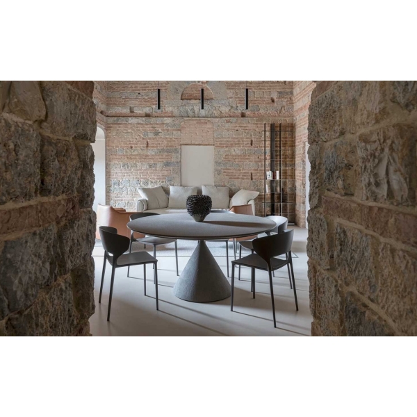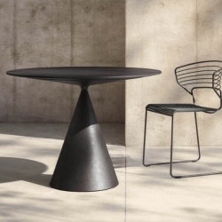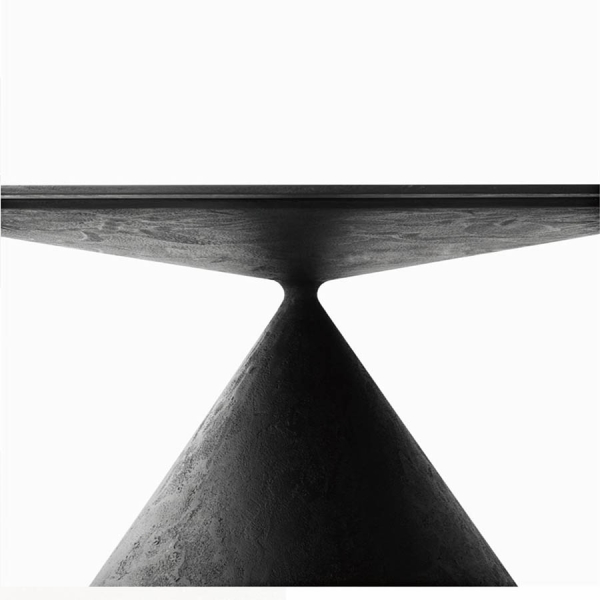 Kahden erilaisen volyymin kohtaaminen saavuttaa pöydässä täydellisen tasapainon - kaksi erimuotoista kartiota kohtaavat toisensa vastakkaisissa pisteissä ja tämä piste uhmaa painovoimaa näennäisesti epävakaassa hengessä. Toisaalta pöytä on kunnianosoitus kaikille pyöreille pöydille joskin vietynä äärirajoille esteettisesti jolloin lopputuloksena on syntynyt uudenlainen, visuaalinen kokonaisuus mutta samalla myös funktionaalinen, käyttökelpoinen huonekalu.