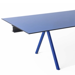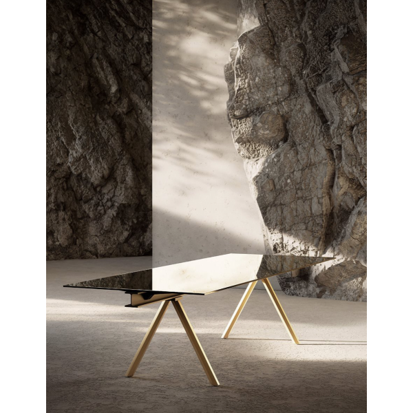 Desalto HEB -pöytä on arkkitehtoninen mestariteos, jossa yhdistyvät tekninen innovaatio ja esteettinen hienostuneisuus. Pöydän kantava runko muodostuu H-muotoisesta, korkealujuusteräksestä valmistetusta palkista, joka on viimeistelty hienostuneella, kiiltävän lakkauksella. Jalat koostuvat teräsrungosta, jonka päällä on tyylikkään kuusikulmainen messinkiputkiverhous – yksityiskohta, joka tuo pöytään ripauksen ylellisyyttä. Desalto HEB on paljon enemmän kuin pelkkä pöytä – se on taidetta, teknologiaa ja tinkimätöntä designia yhdessä veistoksellisessa kokonaisuudessa. Täydellinen valinta niin edustustilaan, neuvotteluhuoneeseen kuin näyttäväksi keskipisteeksi moderniin kotiin.