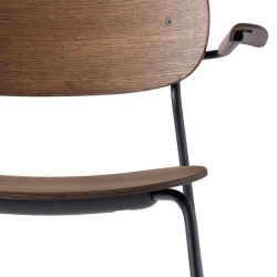 Näissä Co Chair Armrest -tuoleissa on sirot käsinojat, sekä mustaksi pulverimaalattu teräsrunko. Puuosat ovat joko vaaleaa mattalakattua tammivaneria, tai ruskeaksi tai mustaksi petsattua tammivaneria.