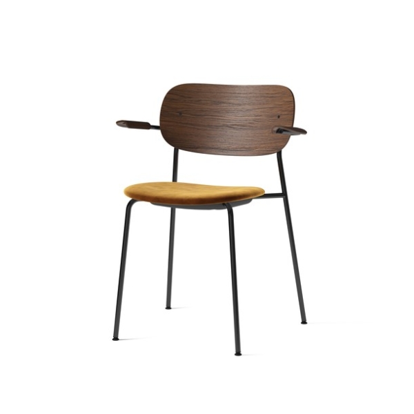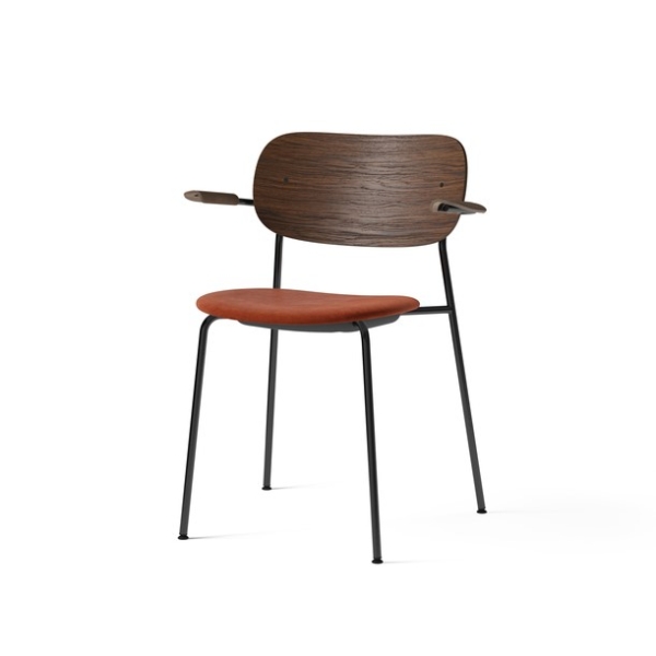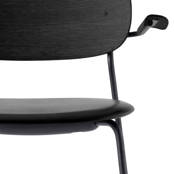 Näissä Co Chair Armrest -tuoleissa on sirot käsinojat, sekä mustaksi pulverimaalattu teräsrunko. Puuosat --selkänoja ja käsinojat-- ovat joko vaaleaa mattalakattua tammivaneria, tai ruskeaksi tai mustaksi petsattua tammivaneria. Istuin on verhoiltu.