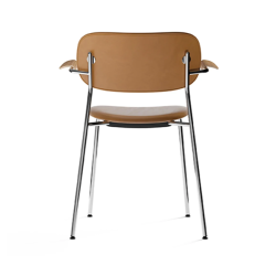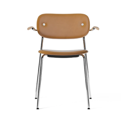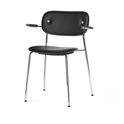 Käsinojilla saatavilla oleva, kolmena puuversiona varustettu, monipuolinen ja täysin verhoiltu Co-tuoli on saatavilla kromijalustalla.