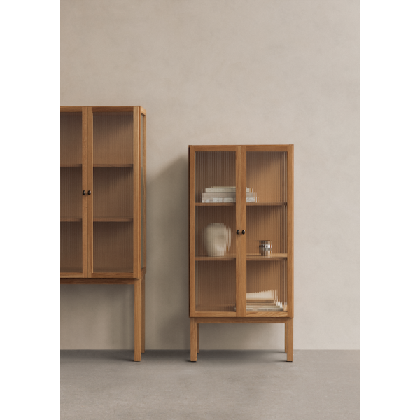 Vitriinikaappi avautuu ja paljastaa kaksi korkeussäädettävää tammiviiluhyllyä, jotka tarjoavat runsaasti tilaa tavaroiden säilyttämiseen. Messingistä valmistetut saranat ja kahvat täydentävät muotoilun.