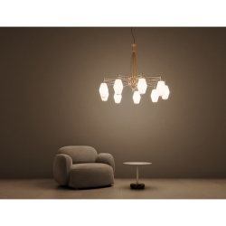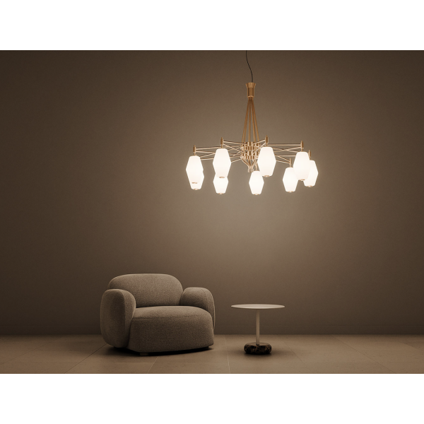 Riippuvalaisimien ja seinävalaisimien rinnalle asennettu kattokruunu nousi yhdeksi sisustuksen silmiinpistävimmistä kappaleista, yhdistäen minimalistisen geometrian valon läsnäoloon.Uudelleenjulkaistu kattokruunu pysyy uskollisena Dahlin 1900-luvun puolivälin visiolle, mutta on samalla mukautettu nykyajan vaatimuksiin. Suupuhallettu lasipallo levittää valoa pehmeästi huoneeseen, ja messinkiyksityiskohdat lisäävät hienostuneisuutta.