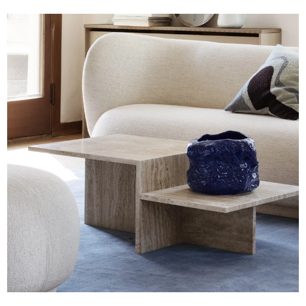 Ferm Livingin Distinct sohvapöytä on saanut innoitusta japanilaisesta minimalismista. Yksinkertainen ja kulmikas rakenne istuu kauniisti yhteen Travertiinin elävän ja rikkaan pinnan kanssa. Pöytä on samalla hienostunut ja tasapainoinen sekä arkkitehtooninen kokonaisuus.