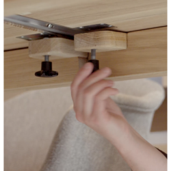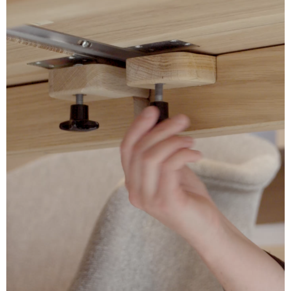 Pöytä jatketaan manuaalisilla vetokytkimillä ja turvallisella lukolla, ja kaikki on valmistettu massiivitammesta.