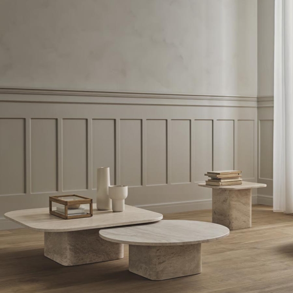 Eida-sohvapöydät yhdistävät yksinkertaiset, veistokselliset muodot ja luonnontravertiinin ainutlaatuiset kuviot, luoden ilmeen, joka on samalla elävä ja rauhallinen. Jokainen pöytä on uniikki, ja eri korkeuksia ja kokoja yhdistelemällä voidaan luoda moderneja, arkkitehtonisia kokonaisuuksia. Ontto jalkaosa tekee pöydästä kevyemmän säilyttäen kuitenkin sen näyttävän ja vahvan ilmeen. Eida-sohvapöytä on täydellinen valinta, kun haluat yhdistää luonnonmateriaalin kauneuden ja minimalistisen muotokielen ajattoman tyylikkääksi kokonaisuudeksi.