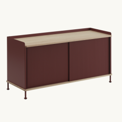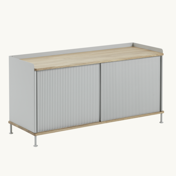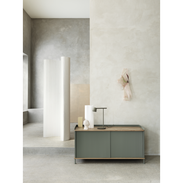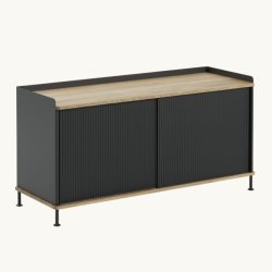 Enfold Sideboard kaapit yhdistelevät massiivitammen lämpöä maalatun teräksen industriaaliin pintaan. Kaapin liukuovet on toteutettu aaltopeltimäisestä, pulverimaalatusta teräksestä, tausta- ja sivupaneelit teräksestä ja tasopinnat mattalakatusta tai maalatusta massiivitammesta. Thomas Bentzen kertoo Enfold kaappien heijastelevan skandinaavista minimalismia ja 1900-luvun puisten kaapistojen henkeä ja niiden visuaalisessa kielessä yhdistyykin niin mennyt kuin moderni sujuvassa liitossa luoden kotoisan auran kaapistojen ylle.