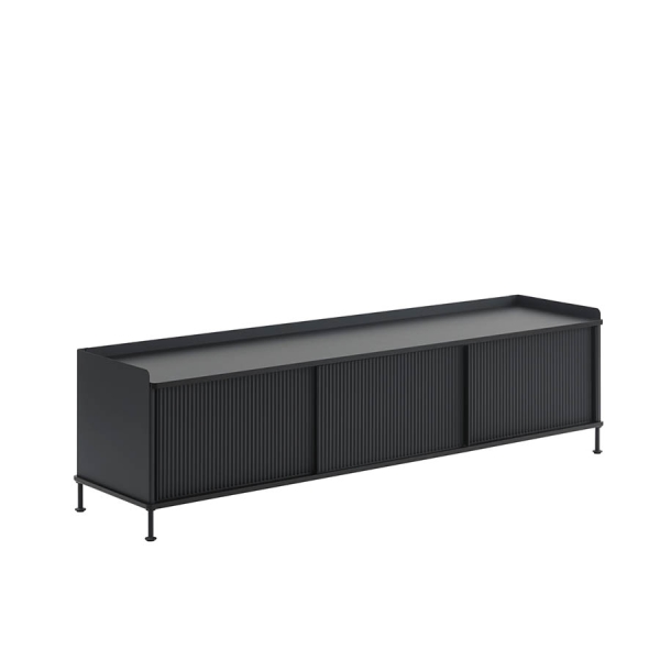 Enfold Sideboard kaapit yhdistelevät massiivitammen lämpöä maalatun teräksen industriaaliin pintaan. Kaapin liukuovet on toteutettu aaltopeltimäisestä, pulverimaalatusta teräksestä, tausta- ja sivupaneelit teräksestä ja tasopinnat mattalakatusta tai maalatusta massiivitammesta. Thomas Bentzen kertoo Enfold kaappien heijastelevan skandinaavista minimalismia ja 1900-luvun puisten kaapistojen henkeä ja niiden visuaalisessa kielessä yhdistyykin niin mennyt kuin moderni sujuvassa liitossa luoden kotoisan auran kaapistojen ylle.