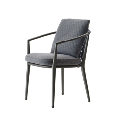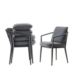 Käsinojallisesta Erica-ruokailutuolista saa kahdenlaista variaatiota; versiossa E61S kaunis verkkopunos jatkuu myös käsinojiin, kun taas E61S_I mallissa käsinojien alus jää avonaiseksi, ja malli on pinottavissa.