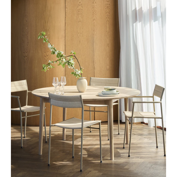 Kaareva laita ja hennosti vinoon osoittavat jalat tekevät pöydälle viimeistellyn keveän ilmeen. Jatkettavuutensa ansiosta pöydän äärelle on mahdollista kokoontua perheen lisäksi myös ystävien kesken