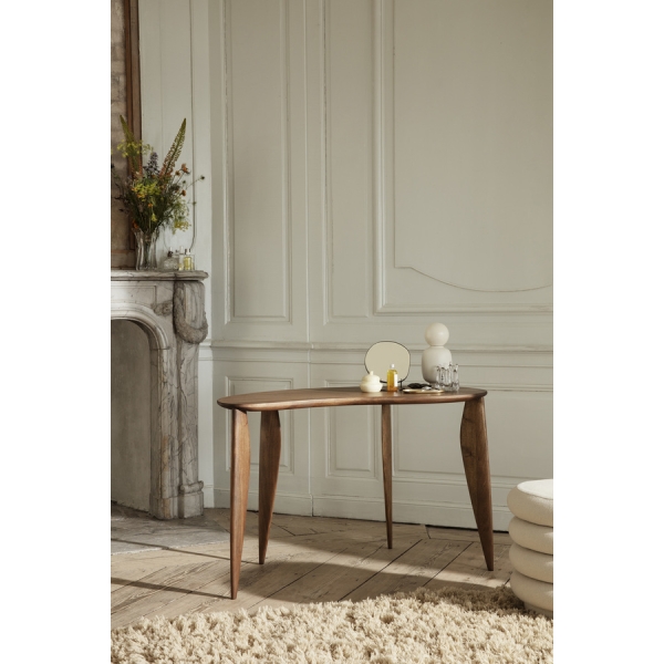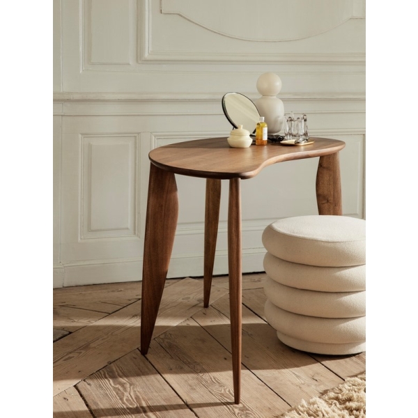 Massiivipuisessa Feve Desk -pöydässä on vivahteikkaan orgaaninen muoto. Nimensä ja muotonsa tämä pieni pöytä on saanut pavulta – ranskaksi fève. Pöydän feminiininstä eleganssia korostaa sen muotoon veistetyt, sirosti alaspäin kapenevat jalat.