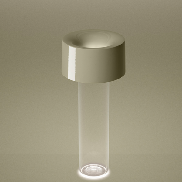 Kun Fleur-valaisin on päällä, valo korostaa lasijalan profiilia ja leviää pinnalle valaisten jalustan ympärillä olevaa aluetta.