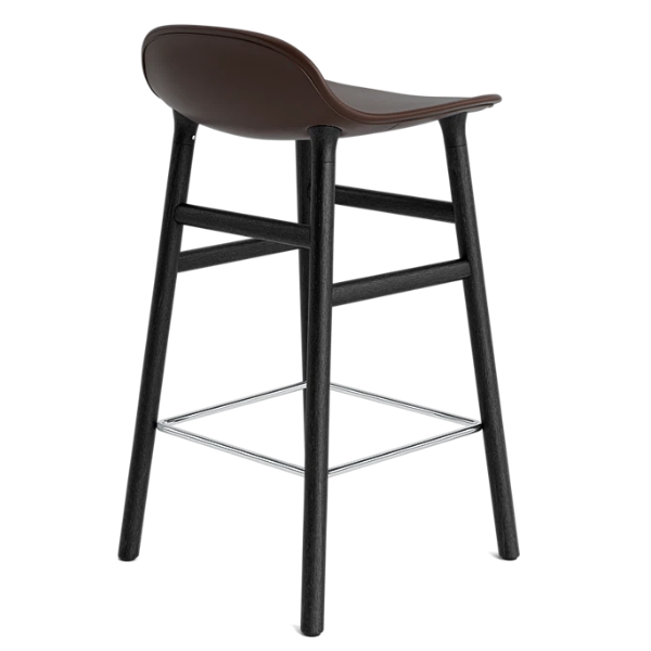 Puurunkoisessa Form baarituolissa tuolissa skandinaavinen, mustaksi petsattu tammirunko yhdistyy verhoiltuun istuinosaan. Tämä matalampi baarituoli soveltuu keittiösaarekkeisiin.