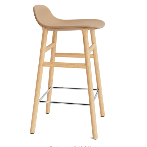 Puurunkoisessa Form baarituolissa tuolissa skandinaavinen tammirunko yhdistyy verhoiltuun istuinosaan. Tämä matalampi baarituoli soveltuu keittiösaarekkeisiin.