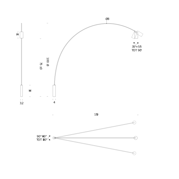 Mitat: korkeus 100 cm, valonlähteen korkeus valaisimen alareunasta75 cm, pituus 150 cm, varren paksuus 0,8 cm, kuvun pituus 10 cm ja halkaisija 5 cm, johdon pituus 3,5 m, jalustan koko 3,2 x 4 x 18 cm