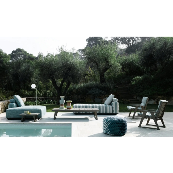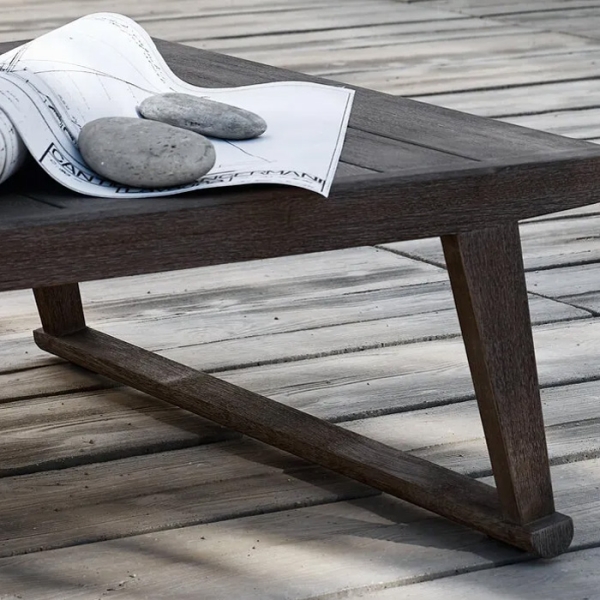 B&B Italian Gio Outdoor -ulkokalustesarja erottuu upealla, antiikkiharmaaksi käsitellyllä tiikkirungollaan, jossa on modernin klassikon charmia.