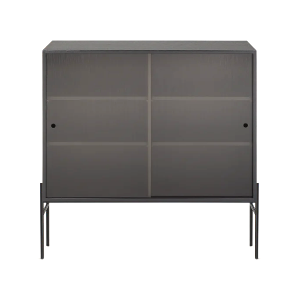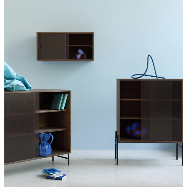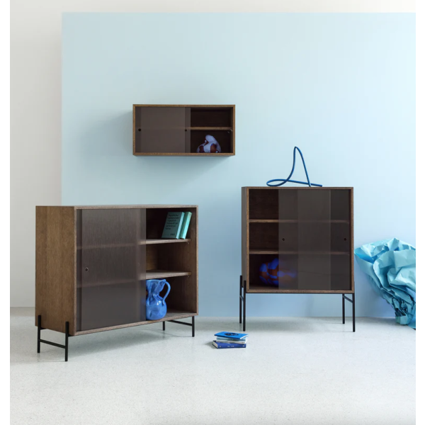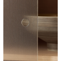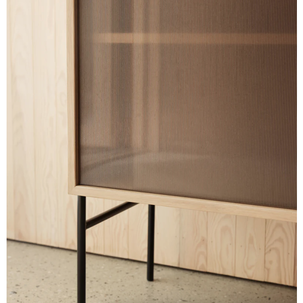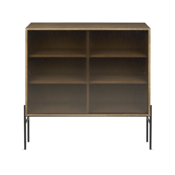 Hienosti uurrettu ja karkaistu, pronssin sävyinen, kiehtova matta ja puoliläpinäkyvä etuosa vihjaa sisällön paljastamatta kuitenkaan liikaa. Tammirunko ja tyylikkäät metallijalat pitävät arkipäiväiset tavarat turvallisesti varastossa ja mahdollistavat suosikkiesineiden tyylikkään esillepanon kaapissa.