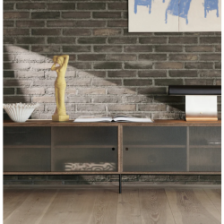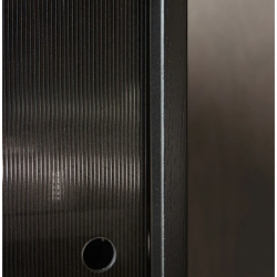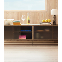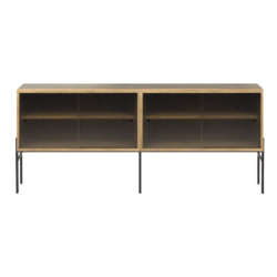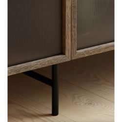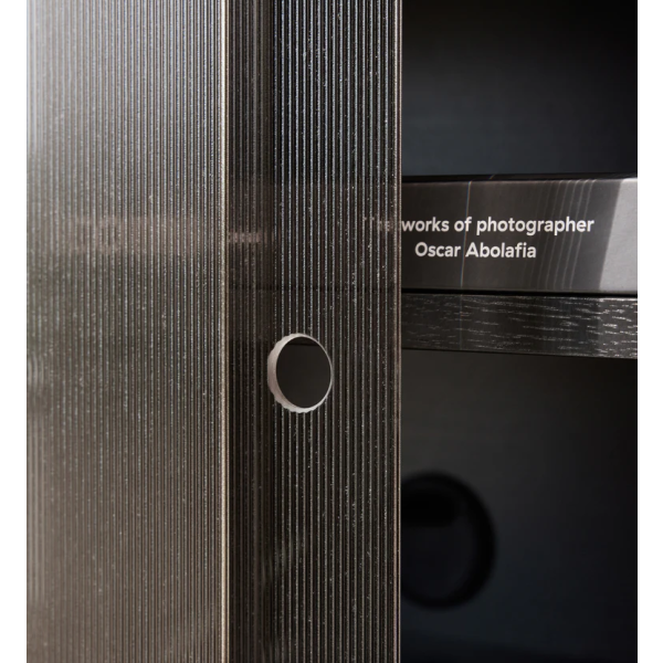 Hienosti uurrettu ja karkaistu, pronssin sävyinen, kiehtova matta ja puoliläpinäkyvä etuosa vihjaa sisällön paljastamatta kuitenkaan liikaa. Tammirunko ja tyylikkäät metallijalat pitävät arkipäiväiset tavarat turvallisesti varastossa ja mahdollistavat esineiden tyylikkään esillepanon kaapissa.