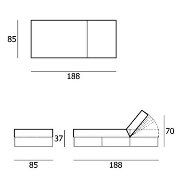 Mitat: korkeus 70 cm, pituus 188 cm, leveys 85 cm, istuin/makuukorkeus 37 cm
