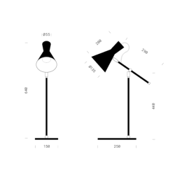 Mitat: jalustan leveys 15 cm, jalustan pituus 25 cm, korkeus 64 cm, varjostimen pituus 20 cm, varjostimen dia 13,5 cm