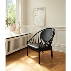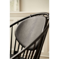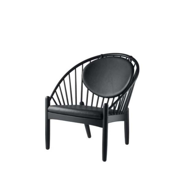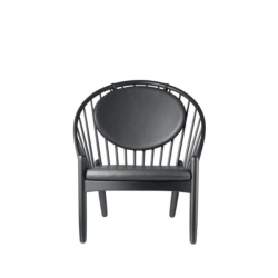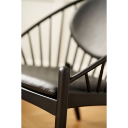 J166 Jørna -nojatuolia valmistetaan rungoltaan mustana ja tammisena. Istuimen ja selkänojan tyynyt on verhoiltu joko kankaalla tai nahkalla; kysy muista vaihtoehdoista liikkeestämme.