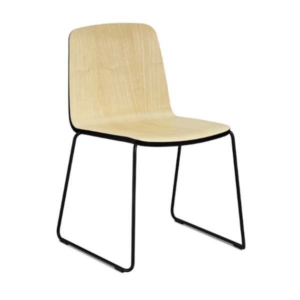 Just pikkutuolissa siro, värillinen teräsrunko yhdistyy saarnipuiseen istuinosaan.