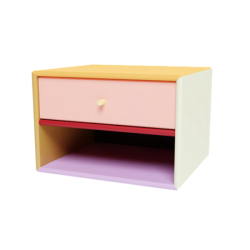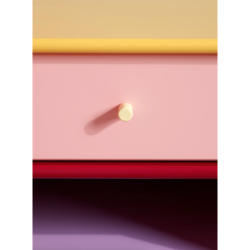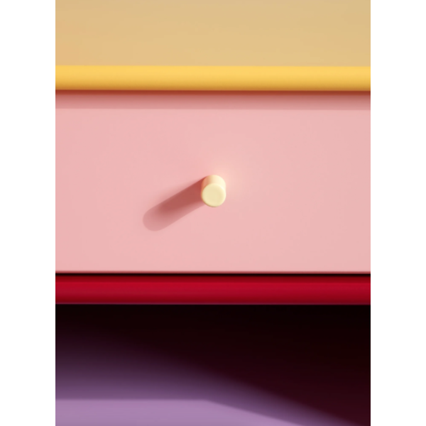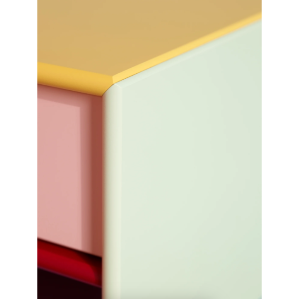 KIMPOP Limited Edition DASH -yöpöydän sivut ovat kuminan, iiriksen, pomelon ja akaasian sävyissä. Takapaneeli on balsamico, kun taas laatikko, kahva ja hylly ovat rubiininpunaisia, kamomillan ja punajuuren sävyisiä.