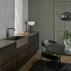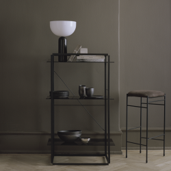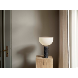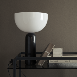 Kahdesta veistoksellisesta muodosta koostuva Kizu-pöytävalaisin leikittelee tasapainoilun ja painottomuuden illuusiolla. Illuusio tuo valaisimen harmoniseen ilmeeseen kiinnostavaa jännitettä. Tässä mustarunkoisessa Kizussa painon ja keveyden jännite on erityisen voimakas.
