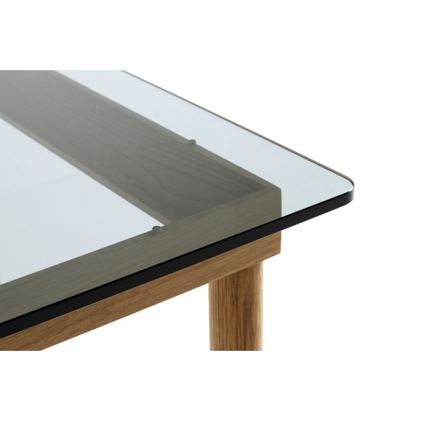 Pöydän rungossa käytettävä puu on FSC-sertifioitua, vesilakattua massiivipuuta, ja pöytälevy karkaistua lasia.