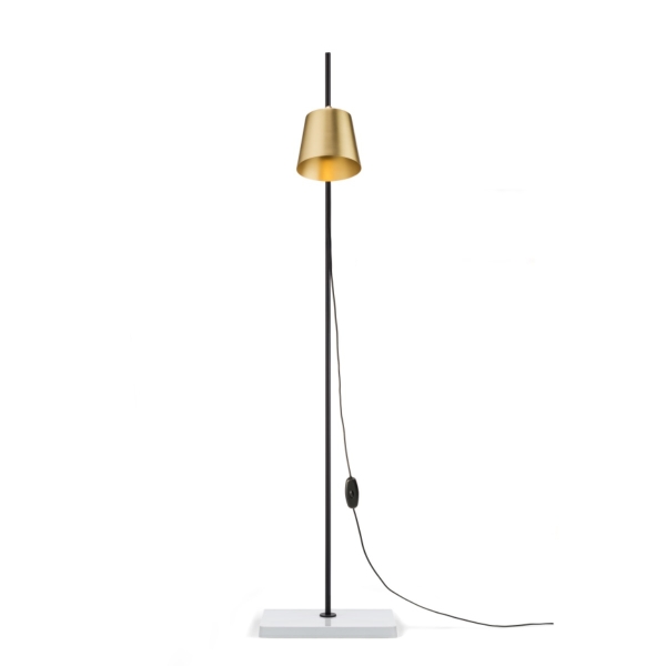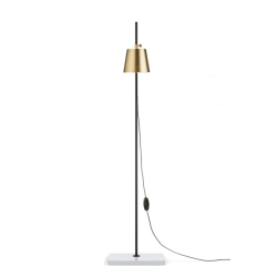 MATERIAALIT: Lampun varjostin on harjattua messinkiä kirkkaalla lakalla, varsi jauhemaalattua terästä, pohja valkoista posliinia, 3,5m musta kumijohto himmentimellä