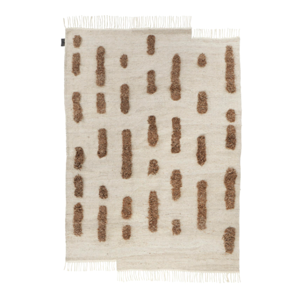 Laine matto on kudottu käsin luonnollisesta, värjäämättömästä ja käsittelemättömästä lampaan villasta.