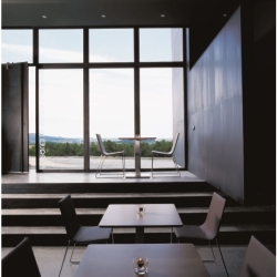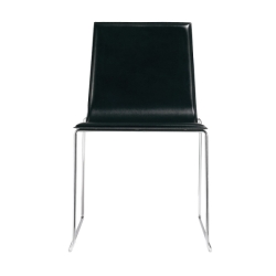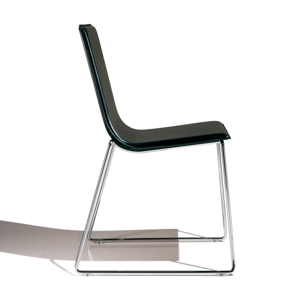 Tämä verkkokauppamme versio on käsinojaton, pinoutuva tuoli SI0582. Tuoli on verhoiltu paksulla satulanahkalla, ja sen jalka on kiillotettua alumiinia.