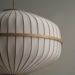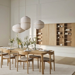 Lucén-valaisin tuo tilaan ajattoman Japandi-ilmeen, jossa yhdistyvät skandinaavinen selkeys ja japanilainen estetiikka. Sen kevyt metallirunko on verhoiltu FSC™-sertifioidulla tammiviilulla, ja herkästi laskeutuva kangas luo pehmeää, tunnelmallista valoa. Saatavilla eri muodoissa ja kokoissa, Lucén sopii monenlaisiin tiloihin ja täydentää harmonisesti niin modernia kuin klassistakin sisustusta.