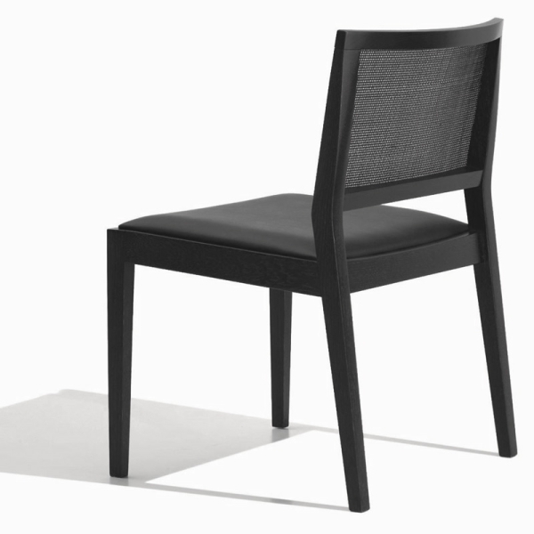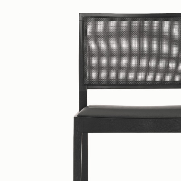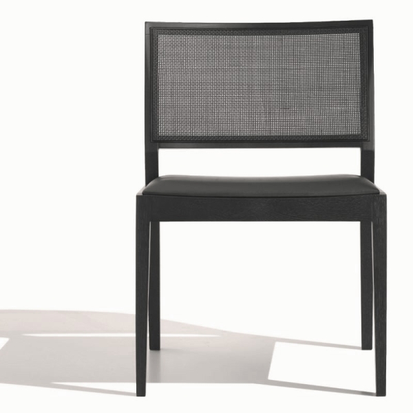 Tämä verkkokauppamme versio on käsinojaton, matalaselkäinen versio SI2132. Tuolin istuin on verhoiltu mustalla nahkalla, ja sen selkänoja on mustaa rottinkipunosta.