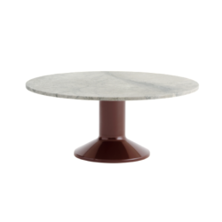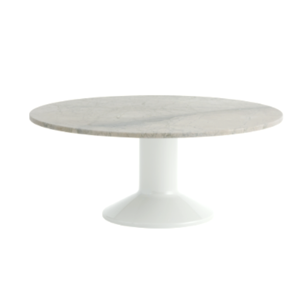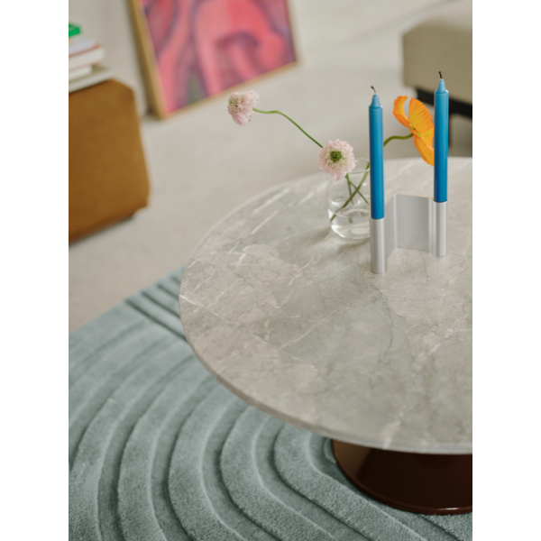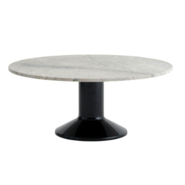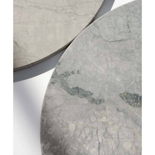 Sen pyöreä, sorvattu teräsjalusta kiiltävällä viimeistelyllä luo silmiinpistävän kontrastin harmaan marmorisen pöytälevyn kanssa. Luonnonkiven harmaan sävyjä, monimutkaisia juovia ja hienovaraisia sinisiä vivahteita löytyy hiotussa mattapinnassa.