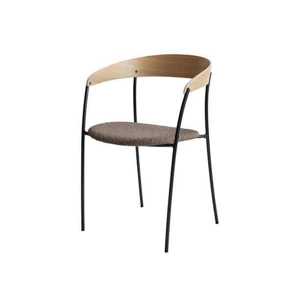 Materiaali: pulverimaalattu teräsrunko, taivutettu tammivaneri, lakka, vaahtomuovipehmuste, bouclékangasverhoilu