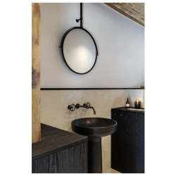 Mitat: leveys 65 cm, syvyys 9 cm, korkeus 109 cm, peilin dia 53 cm, varsi 56 cm