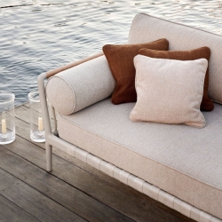 Open-Air sohva on saatavissa joko vasemmalle tai oikealle suunnatulla avoimella päädyllä, jossa on integroitu sivupöytä tiikkilamelleissa.