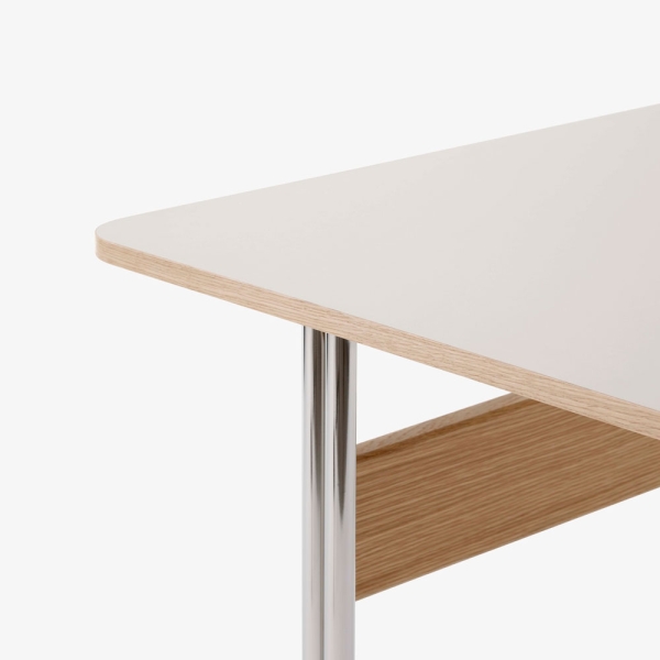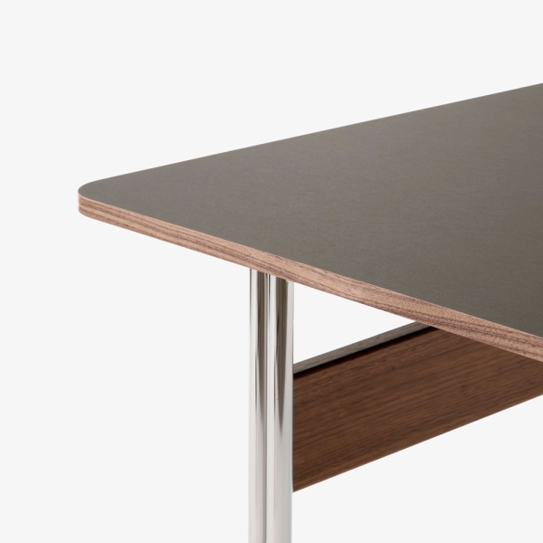 Työpöydän sirot jalat ovat taivutettua teräsputkea joko kromattuna tai mustaksi pulverimaalattuna. Pöydästä on saatavilla kolme viimeisteltyä väriyhdistelmää. Kansilevy on päällystetty Forbo linoleumilla ja laita on joko tammea, mustaksi petsattua tammea tai pähkinää.