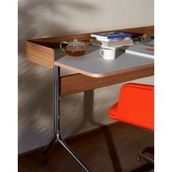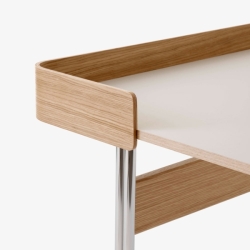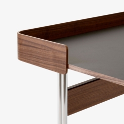 Työpöydän sirot jalat ovat taivutettua kromattua teräsputkea. Pöydästä on saatavilla kaksi viimeisteltyä väriyhdistelmää. Kansilevy on päällystetty Forbo linoleumilla ja takapaneeli on muotoonprässättyä tammi- tai pähkinävaneria.